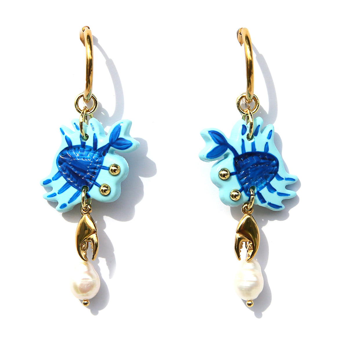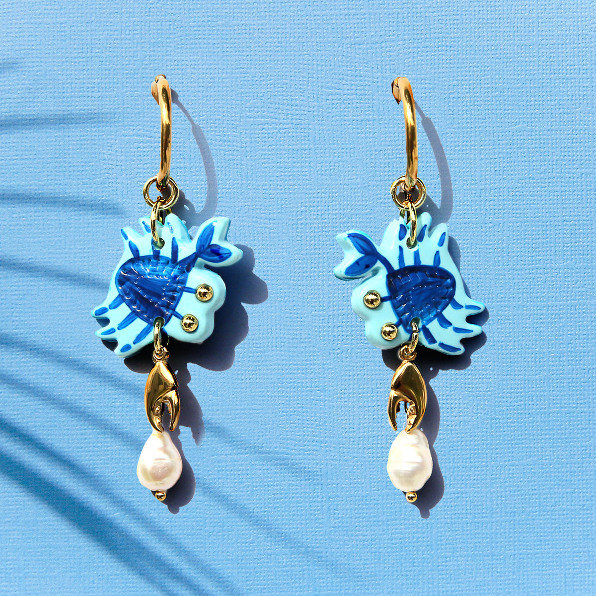 Handmade polymer clay earrings on surgical steel gold coated hoops. Featuring fresh water pearls hung off a gold coated chain.