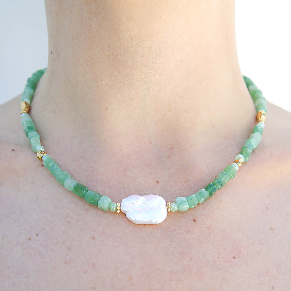 Handmade necklace featuring a keshi pearl, glass beads and quartz.